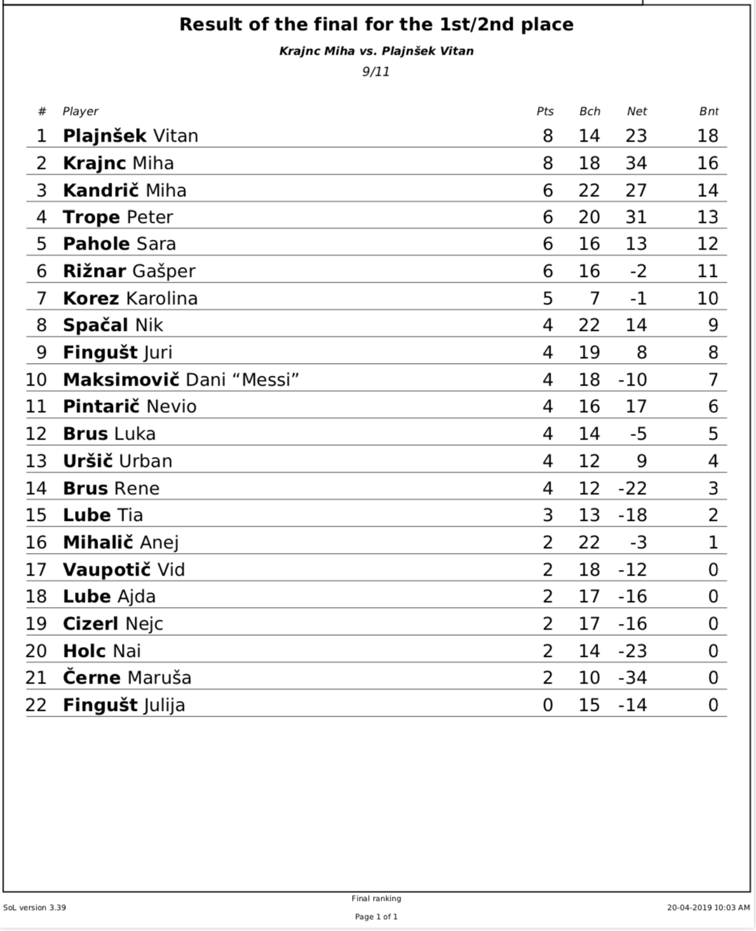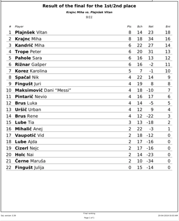 Drage prijateljice in prijatelji carroma. Za nami je veliki finale sezone, II. Mladinsko državno prvenstvo v carromu. Prvenstva, ki je potekalo v “Hiši druženja”, se je udeležilo 22 nadobudnih igralk in igralcev, starih med 6 – 18 let. Po razburljivih 4 krogih tekmovanja, sta se v finale uvrstila Miha Krajnc in Vitan Plajnšek, vsak s po štirimi zmagami. NOVI MLADINSKI DRŽAVNI PRVAK V CARROMU ZA LETO 2019 JE POSTAL VITAN PLAJNŠEK, kateri je v napetem finalu slavil z rezultatom 11:9. Vsakemu tekmovalcu in tekmovalki čestitamo za dosežen rezultat, staršem in ostalim obiskovalcem dogodka, donatorjem pa iskrena hvala, da podpirate carrom v Sloveniji.